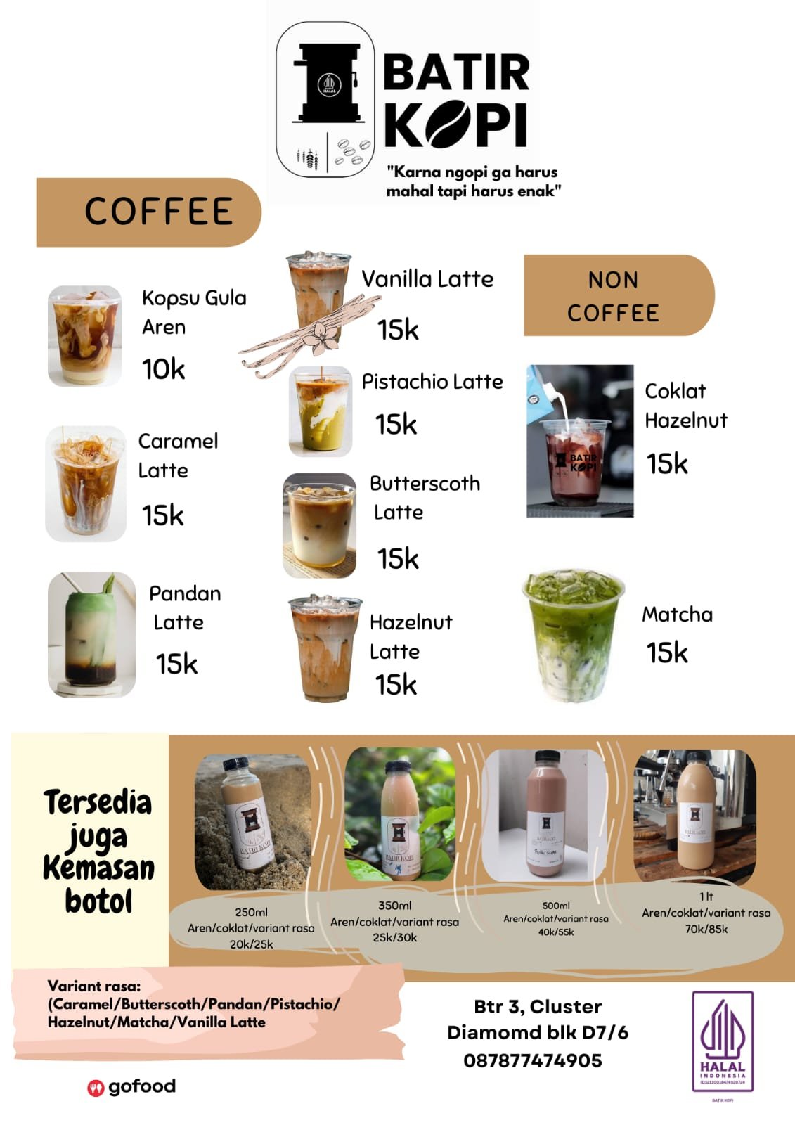 Menu andalan Batir Kopi meliputi kopi susu botolan (250ml-1L) dan cup 12oz, serta varian latte rasa seperti caramel, pandan, dan hazelnut. Setiap minuman dibuat dengan bahan-bahan berkualitas dan disajikan dengan cinta pastinya, sehingga kamu dapat menikmati rasa yang autentik dan lezat.