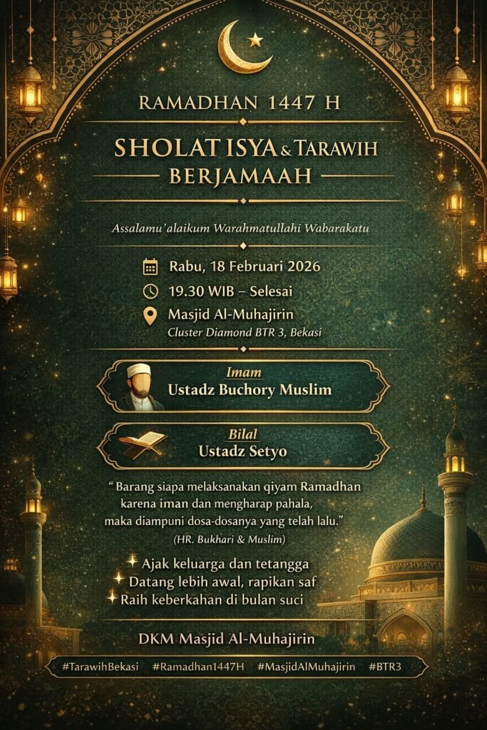 Cluster Diamond – Malam Pertama Sholat Tarawih Berjamaah di Masjid Al Muhajirin Cluster Diamond BTR 3 Bekasi menjadi momen yang penuh makna bagi seluruh warga dalam menyambut datangnya bulan suci Ramadhan 1447 H.